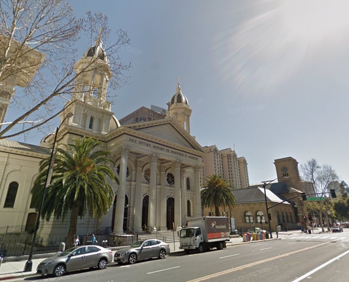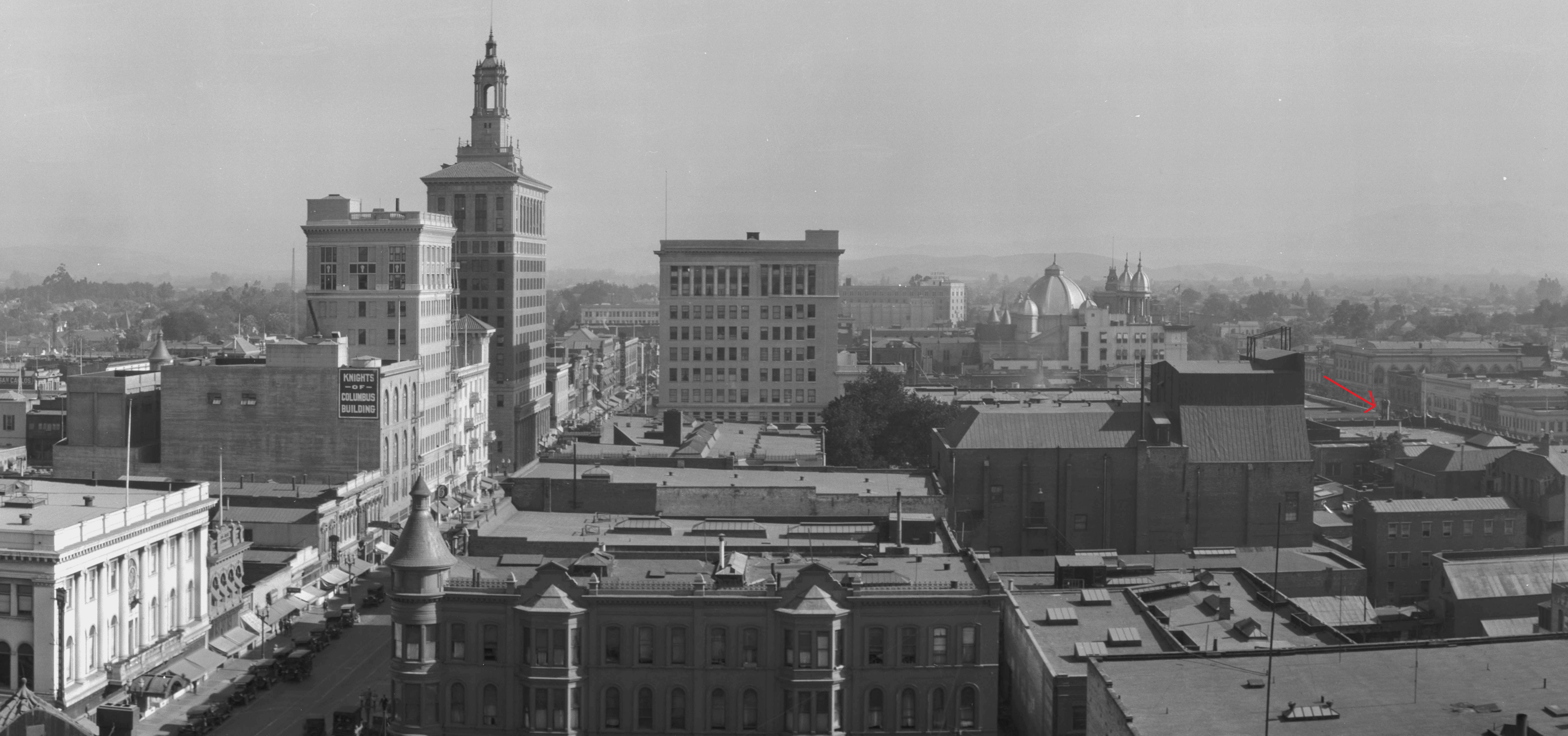A closer view of the west side of the former Masonic Temple (center), and at back, the former St. Clement’s Church (LAPL), both long demolished.