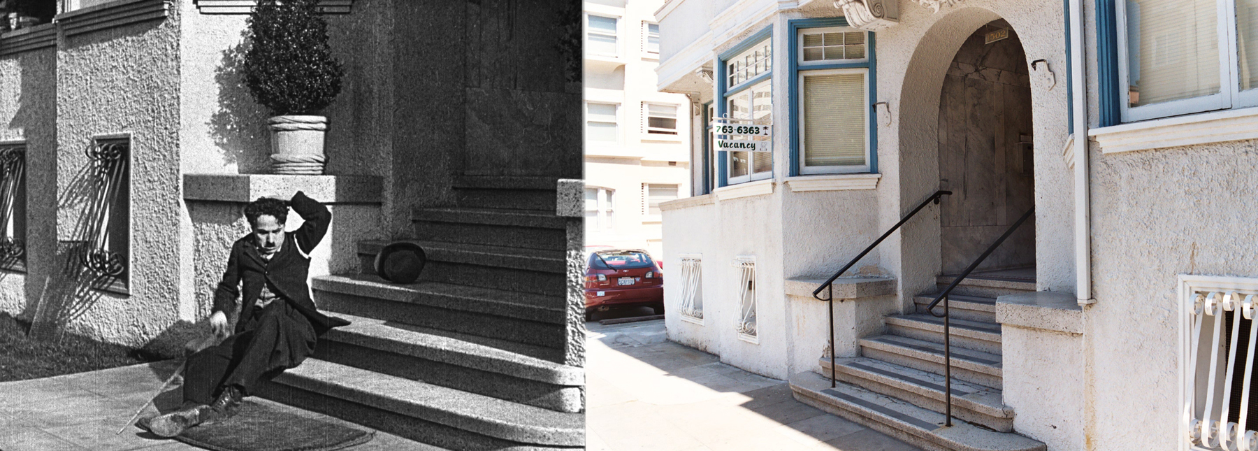 the film’s many exteriors were all filmed, unsurprisingly, in Los Angeles instead. But as shown below, the movie intersects remarkably with classic films made by Charlie Chaplin, Harold Lloyd, and Stan Laurel, while documenting historic LA settings, including its long lost Chinatown. This brief shot at left, looking west towards the Ferry Building, is the lone scene filmed in San Francisco.