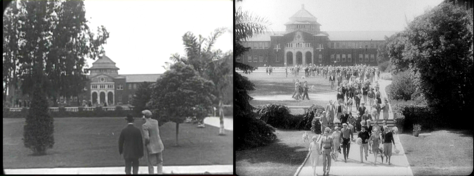 The afternoon screening also includes the 1924 Stan Laurel short comedy Detained, recently restored by Lobster Films in collaboration with the Fries Film Archief (Holland), below, where Stan’s prison release matches where Charlie Chaplin was released from prison in Police (1915), both beside the former north gate to the Los Angeles County Hospital – LAPL. Read more about them filming at the north hospital gate, and about Laurel & Hardy filming The Second Hundred Years (1927) and The Hoose-Gow (1929) at the west hospital gate HERE.
